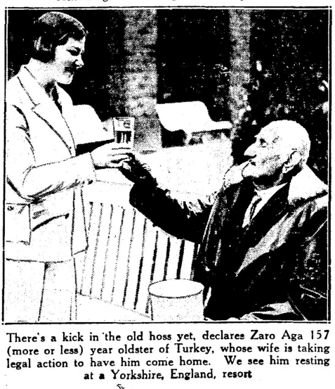 Zaro Aga claimed, among other things, that he was born in 1764, that he had met Napoleon, that he had fought in six wars, and that he had been married 11 or 12 times and fathered approximately 36 children. Starting in 1930, he toured the United States and travelled with circus shows. He did not believe in equality of the sexes, stating that women should have long hair, wear skirts, and remain indoors.