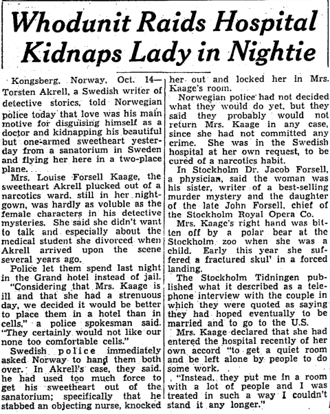 I did a bit of searching and went down a variety of interesting rabbit holes. First off: I could find no evidence that Torsten Akrell (also written as Thorsten Akrell) wrote detective stories. He appears to have been a lieutenant and a special agent of the Swedish Defense Staff during the Second World War, part of a team responsible for smuggling secret agents into Poland and Hungary. He also took on missions for the Allies in wartime Berlin. Given this history, smuggling a woman out of a sanitorium would have been a relatively stress-free exercise.