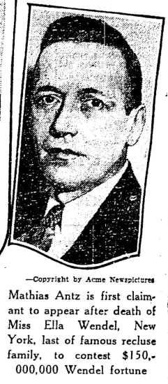 When Ella Wendel passed away, a total of 2303 claimants to her fortune appeared, of which Mr. Antz, shown above, was presumably the first. Entire villages in Germany, supposed cousins from Czechoslovakia, and a Scottish house painter, among others, attempted to claim a share of the estate; almost all of them were exposed as frauds, and the vast majority of her fortune went to various charities. (Reports that she left all of her estate to her poodle, Tobey, are apparently an urban legend.)