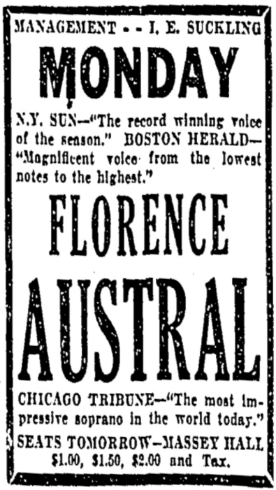 Florence Austral (1892-1968) was born Florence Mary Wilson; she took her stage name to honour her native Australia. She was discovered singing in a choir in Melbourne and she went on to perform in Berlin and Covent Garden in London, among others. She started becoming afflicted by multiple sclerosis in 1930 and the disease forced her to retire in 1940.