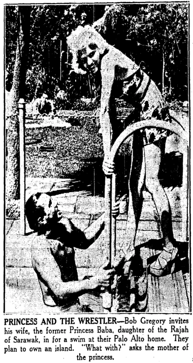 A British wrestling heritage website has an entry on Bob Gregory and his princess bride. In 1937, he met and married Valerie Brooke, the youngest daughter of Charles Vyner Brooke, an Englishman who was the last Rajah of Sarawak. Ms. Brooke had appeared in the movie The Charge of the Light Brigade (1936), billed as Princess Baigum.