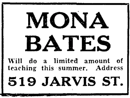 I looked Ms. Bates up in the Toronto city directories. She was listed as a musician; in later directories, she is listed as a music teacher. She remained at 519 Jarvis for a long time; she is listed in the 1960 directory and I didn't check after that.
