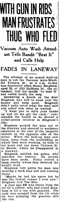 This edition of the Toronto Daily Star contained a photo of a man who prevented an armed robbery of his service station. A further article appeared later in that day's paper: