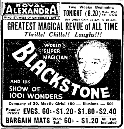Harry Blackstone Sr. (1885-1965) was one of the last of the old-school breed of magicians who performed in white tie and tails. He was arguably at the peak of his career in the 1940s, as a comic book and a radio series were created in that decade that featured him. His son, Harry Jr., also became a magician.