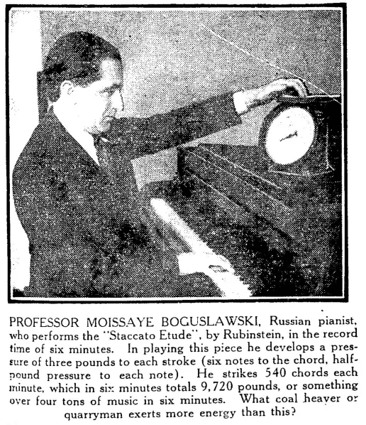 Moissaye Boguslawski (1887-1944) was actually American; he was born in Chicago after his parents had immigrated from Russia. Despite a poverty-stricken background, Boguslawski became proficient enough at the piano to be named head of the piano department at the Kansas City Conservatory of Music when he was just 20 years old. He later taught in Chicago and formed the Boguslawski College of Music. He also played all of Bach's piano music and all of Beethoven's sonatas on a Chicago radio station, which took him 21 weeks.