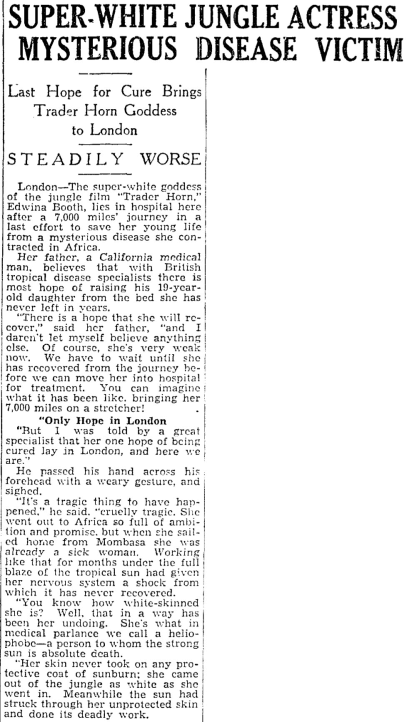 Edwina Booth (1904-1991) sued MGM for over a million dollars, claiming that she had been provided with inadequate protection and clothing during the filming of Trader Horn. (During filming, she caught malaria, suffered from sunstroke, fell out of a tree, was cut by elephant grass, and may have caught schistosomiasis.) She reportedly settled for $35,000, which was a large sum of money in those days (and isn't that small of a sum these days). The "super-white goddess" references in the article are because she played "Nina Trent, the White Goddess" in that movie.