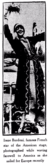 Irène Bordoni (1885-1953) was originally from Corsica, and appeared in films and plays in Paris as a child actor. She emigrated to the United States in 1907, and appeared in a number of plays, including Cole Porter's musical Paris in 1928. This musical featured the song "(Let's Do It) Let's Fall in Love". At her peak, she had homes in New York, Paris, and Monte Carlo.