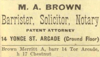 I also looked back in old city directories. There is a Merritt A. Brown working as a barrister, notary public and patent attorney in the 1900 city directory. And he placed an ad in the 1902 directory: