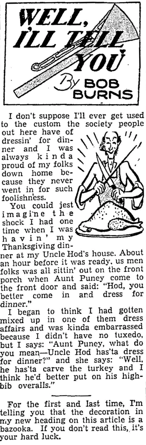 Burns wrote the "Well, I'll Tell You" column from 1936 to 1940. The illustration in the column title is, indeed, of his bazooka. He invested his radio earnings in land, which made him wealthy, and he regularly worked a farm in the San Fernando Valley. He spent his final years there.