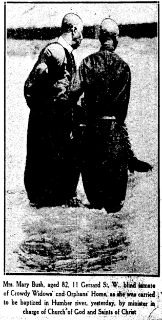 The 1931 Toronto city directory lists a Mary Bush at apartment C3, 42 Maitland Street; she was the widow of Dexter C. Bush. She had been recently widowed, too, as the 1930 directory lists him. I have no idea whether this is the woman in the photo. The 1932 and 1933 directories do not list her, so if this is her, she didn't survive her baptism for long.