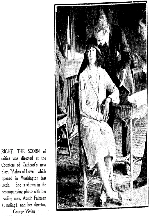 The Earl of Cathcart obtained a divorce from his Countess in 1922 and the Earl of Craven left her in 1925 to return to his wife. In response, the countess wrote Ashes of Love, a play based on her life, in eight days. British government censors refused to allow the play to be performed in London, so the countess set sail for America.