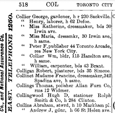 Looking forward: the 1895 directory lists her as a dressmaker and also lists her as the widow of John M. Collinet. Sadly, she was a widow quite young and was quite likely a widow when she moved to Toronto. The 1900 directory lists a "Frances Collinet" who was the widow of Louis C.; this is likely poor data collection, as she appears in the 1910 directory as Francine Collinet, widow of John. I also found her in the 1920 directory.