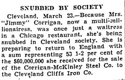 Laura Mae Corrigan (1879-1948) inherited her husband's fortune when he unexpectedly dropped dead in 1928. After returning to England, she lived on an income of $800,000 a year in London during the 1930s.