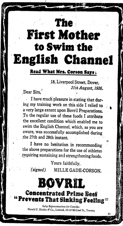 Ms. Corson's Wikipedia page claims that her husband, rowing behind her, fed her hot chocolate, sugar lumps, and crackers as she swam the Channel. I suppose that the hot chocolate might very well have contained Bovril.
