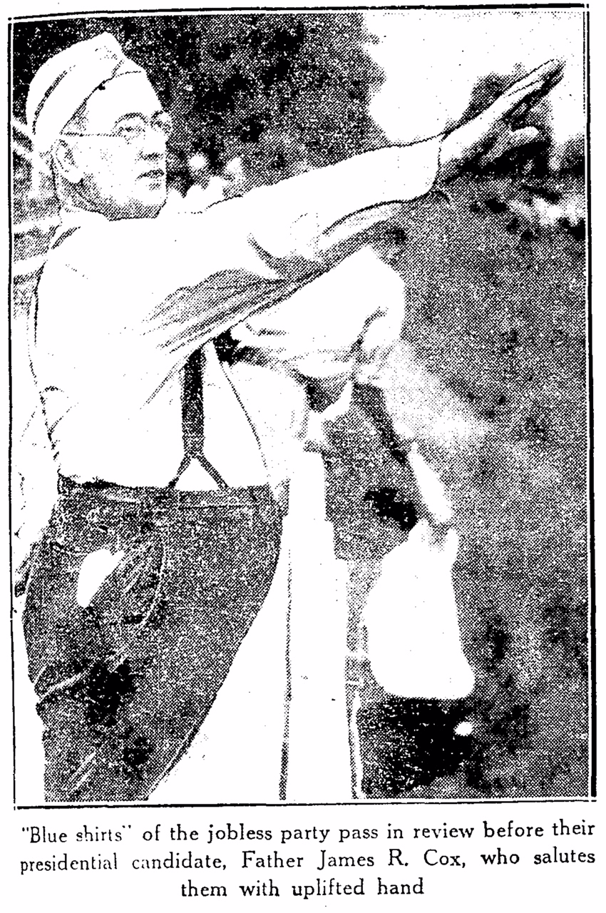 The reference to "blue shirts" and the Hitler-like salute seem ominous, but James Renshaw Cox (1886-1951) was not a fascist: he was a priest and a pro-labour activist. In 1932, Cox led 25,000 jobless men from Pennsylvania to Washington, D.C., which was the largest demonstration in the United States capital city to that time.