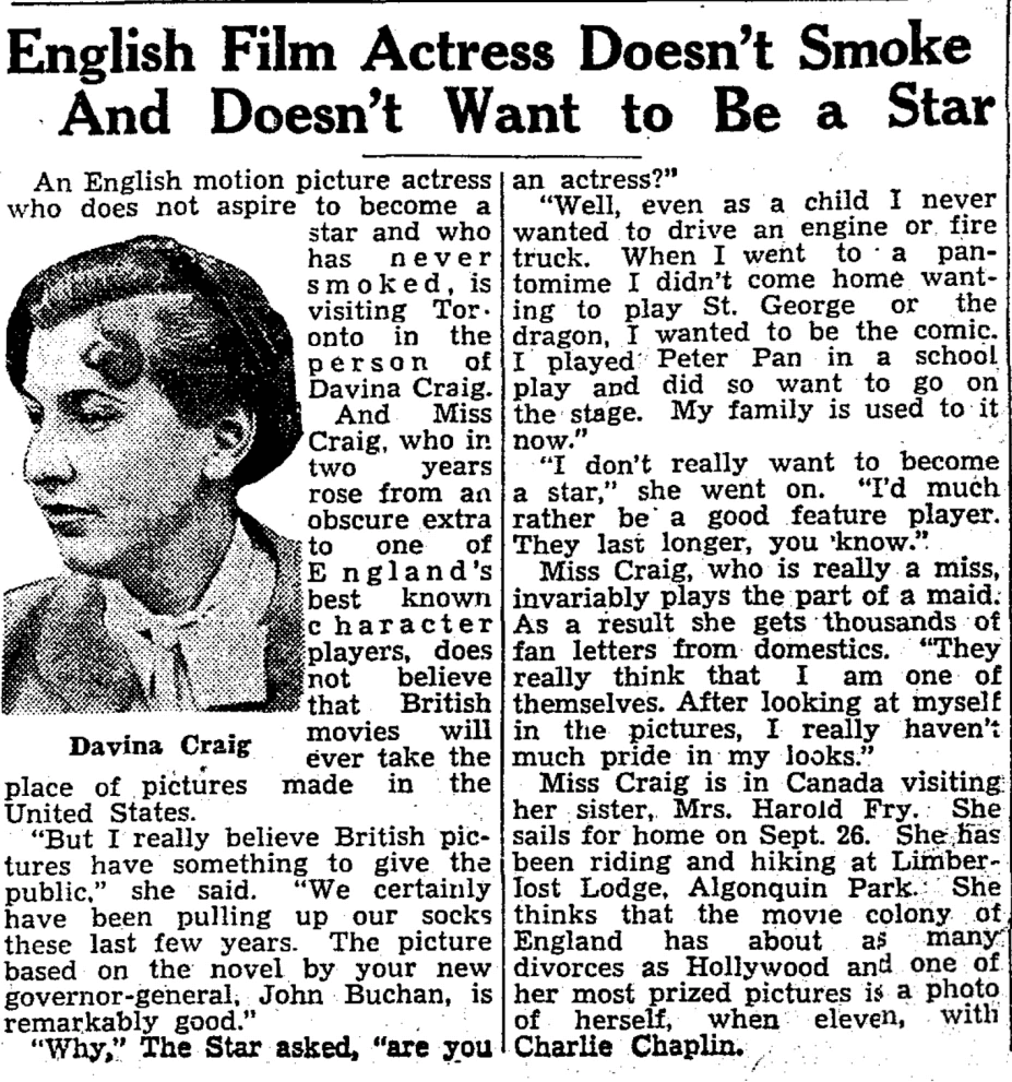 Davina Craig (1912-2002) was the stage name of Davina Smith, who became Davina Whitehouse when she got married in 1941. She was signed by Twickenham Studios in Britain in 1932 and appeared in a number of movies for them between 1933 and 1939.