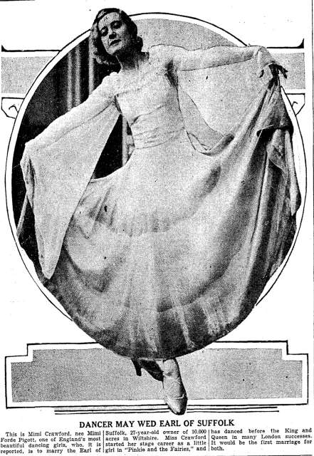 Mimi Crawford (1897-1966) was born Minnie Mabel Forde Pigott in Chicago. She did indeed marry the 20th Earl of Suffolk. The Earl had a short but heroic life: during the Second World War, he rescued the world's entire supply of heavy water from France before it fell and then worked as a bomb defuser in London. He successfully defused 34 bombs before his luck ran out on May 12 1941.