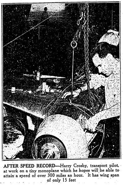 Harry Crosby went on to sustain serious back injuries when testing his CR-3 plane (which might have been this one). Undeterred, he designed the CR-4 plane while recovering, and finished in third place in the 1939 Greve Trophy race, part of the National Air Races. His plane was unofficially clocked at 386 mph in one test flight, which would have given him the record.