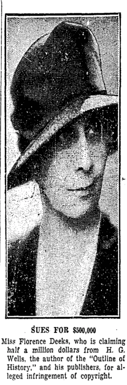 Florence Deeks (1864-1959) initiated her lawsuit against Wells in 1928. After the trial judge and the Appellate Division of the Ontario Supreme Court rejected her suit, she went to the final court of appeal, the Judicial Committee of the Privy Council in London, which heard her case in 1932. The committee dismissed her suit, claiming that literary criticism does not count as evidence in a court of law.