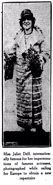 Juliet Delf (1889-1962), sometimes known as Miss Juliet, performed in vaudeville from at least 1913 to 1928. A search turned up: