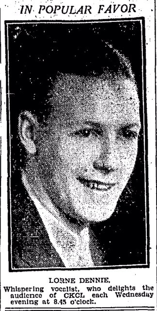 The 1929 Toronto city directory lists a Lorne N. Dennie as a bookkeeper at J. E. Dennie Limited, a manufacturer of paper bags, and living at 38 Alhambra Avenue; the 1930 directory doesn't list him but the 1931 directory has him back at the same address. It's possible that he went off in 1930 in search of fame and fortune as a whispering vocalist before giving up and returning to the family business; it's more likely that the directory just left him out by accident that year.