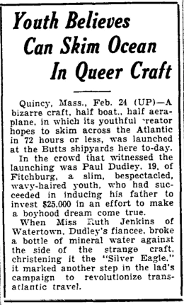 Paul Dudley was a young man who had built a combination boat/airplane, named the "Silver Eagle", with which he hoped to cross the Atlantic Ocean. The article was less than sympathetic to the young inventor, especially since he had spent a lot of money: $25,000 in 1930 is equivalent to over $433,000 in 2025 dollars.