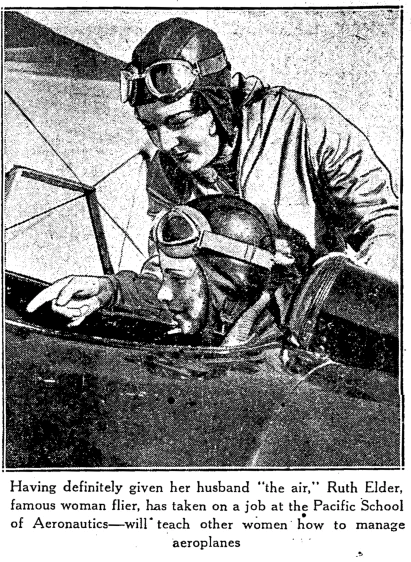 Ruth Elder (1902-1977) was one of the aviation pioneers who was good enough (or perhaps lucky enough) not to die young. Called the "Miss America of Aviation", she was the first woman to attempt to travel across the Atlantic Ocean in a plane, trying this in 1927. She didn't quite make it, but she and her pilot were rewarded with a ticker-tape parade anyway, and she was given a movie contract, appearing in some films in the late 1920s.