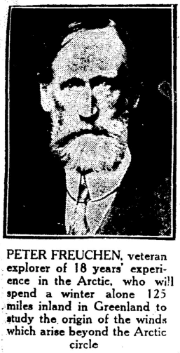 Peter Freuchen (1886-1957) was a Danish explorer who first travelled to Greenland in 1906. He continued his explorations there between 1910 and 1924. His Wikipedia page does not mention his winter alone in Greenland, but it does state that he lost a leg to frostbite in 1926.