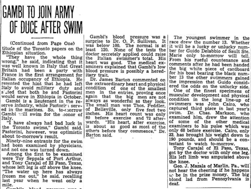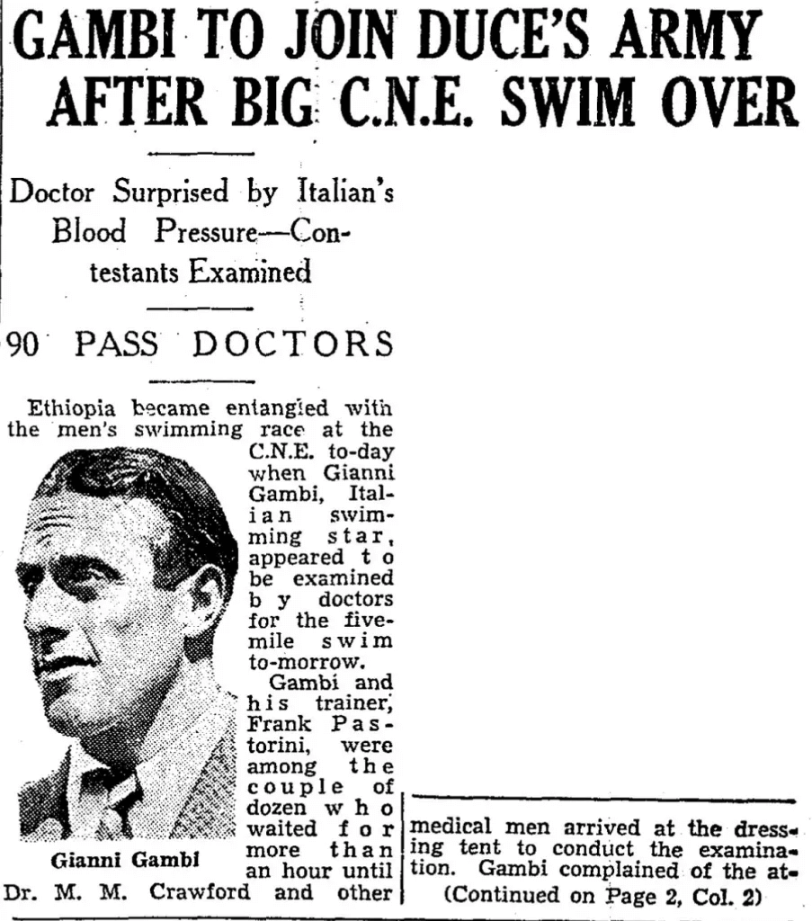 Despite being asked to fight in Benito Mussolini's army, Gianni Gambi (1907-1986) survived the Second World War. Before the war, he had competed for Italy in freestyle swimming at the 1928 Olympic Games. After the war, he swam the English Channel and swam between Naples and Capri.