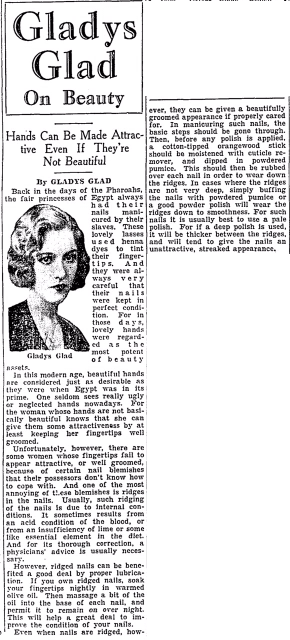 Gladys Glad (1907-1983) - apparently, that was her real name - appeared in a number of Ziegfeld revues. She married (and remarried) journalist and film producer Mark Hellinger. She has a French Wikipedia page but not an English one.