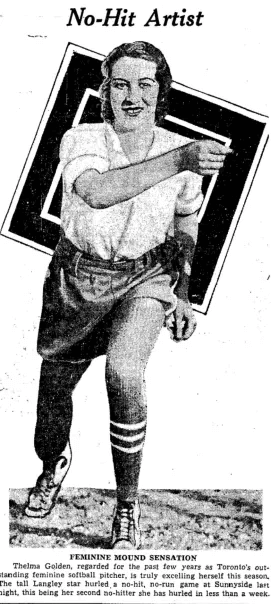 Thelma Golden (1915-1980) started her softball career in 1928. She auditioned at Wrigley Field in Chicago for the All-American Girls Professional Baseball League in 1943. She signed a contract to play for the Rockford Peaches, but had to give it up because she had sustained a serious rib injury three years earlier; the contract called for her to pitch 60 games, which was too much for her after the injury.