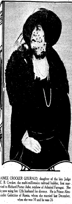 To say that Aimée Crocker Gouraud (1864-1941) led an unusual life would be an understatement. Her birth name was Amy Crocker, and she was born into a prominent and wealthy California family. In 1875, she inherited $10 million when her father passed away. In 1880, her mother sent her to a finishing school in Germany, as apparently she was "boy-crazy"; while in Europe, she briefly became engaged to Prince Alexander of Saxe Weimar and had a fling with a Spanish bullfighter.