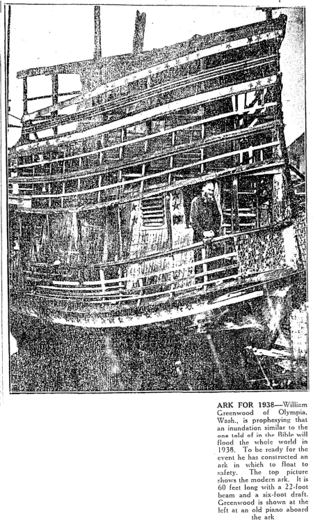 A search turned up several references to Mr. Greenwood and his preparation for an impending flood. Weird Universe has an article on him, which mentioned that Mr. Greenwood had been building an ark since the 1920s (other sources say 1920), and had predicted an impending deluge in 1928, 1932, and then 1938. In 1942, the city of Olympia burned his ark, claiming it was a fire hazard; he promptly built a smaller one and predicted a 1952 flood. He passed away in 1958 at the age of 91, surrounded by the animals that he hoped to save with his ark.
