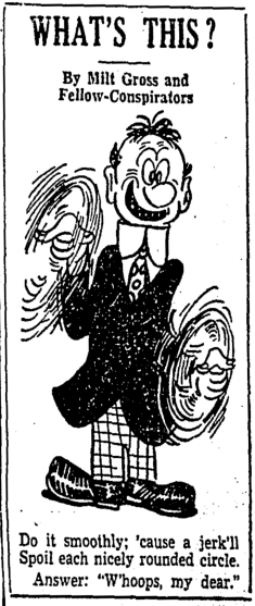 Milt Gross (1895-1953) was an American cartoonist noted for his exaggerated style and Yiddish-inflected dialogue. He went into semi-retirement after suffering a heart attack in 1945. He suffered another attack in 1953 when returning from a Hawaiian vacation with his wife; this heart attack killed him. In his honour, the National Cartoonists Society established the Milt Gross Fund to help cartoonists who were down on their luck financially.