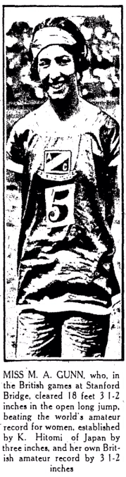 Muriel Gunn (1906-1996) broke the women's world record in the long jump in 1926, and then broke it again in August 1927, at the time of the above picture. Kinue Hitomi, her Japanese rival, recaptured the world record in 1928.