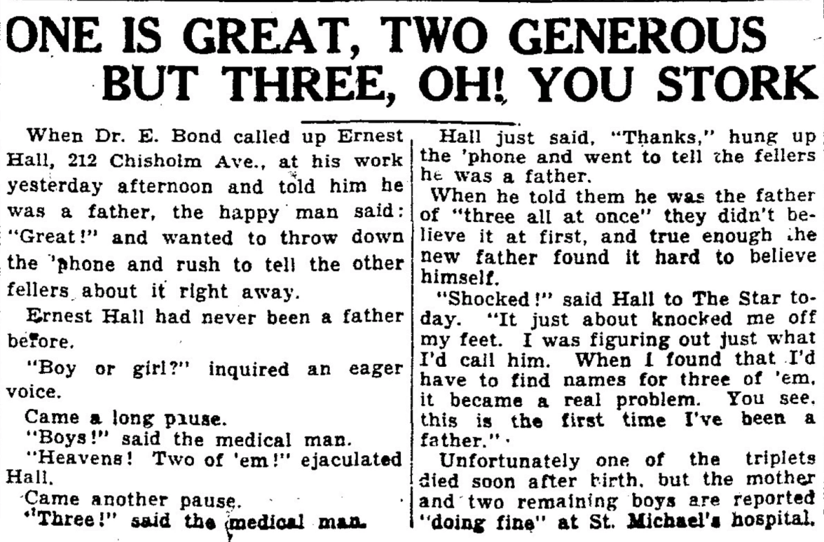 Mr. Hall was still at 212 Chisholm in 1951. A quick search of all of the Halls in that year's directory didn't reveal anyone of that name living with him; I picked that year because the two surviving triplets would have reached their age of majority in that year. However, the 1953 directory lists George E. Hall working as a clerk at B A Oil and living at 212 Chisholm; I have no idea whether he was one of the twin boys or whether he was another son of Ernest Hall. His surname is very common, so it was difficult to trace.
