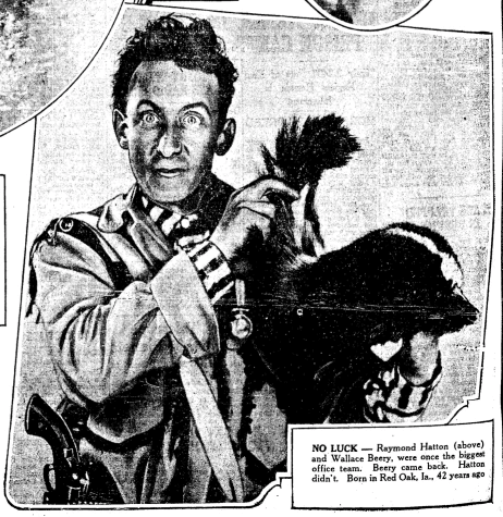 Raymond Hatton (1887-1971) may never have returned to stardom, but he kept working: he appeared in over 500 movies during his lifetime. During the late 1930s and 1940s, he specialized in westerns; he appeared regularly as Rusty Joslin in the Three Mesquiteers series of movies, and he played Marshal Sandy Hopkins in over two dozen films in the "Marshal Nevada Jack McKenzie" series.