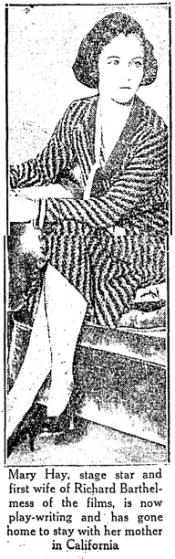 After she and Richard Barthelmess divorced, Ms. Hay married Vivian Bath, a British rubber merchant who lived in Singapore. If, as this photograph claims, she was going home to stay with her mother, it seems to indicate that her second marriage was already not going well; at any rate, the couple divorced in 1934.