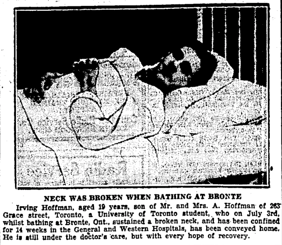 Because I am morbidly curious, I looked up the Hoffmans in the Toronto city directory. I found Aaron Hoffman at 263 Grace in the 1928 directory – he was working as an agent for Metropolitan Life. Irving first appears in the 1934 directory, at the same address as his father, and is listed as a tinsmith in the 1935 directory. So he seems to have survived his accident.