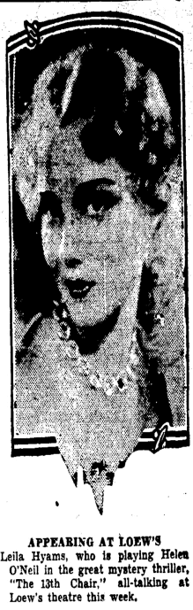 Leila Hyams (1905-1977) appeared in movies from 1924 to 1936. She was blonde with blue eyes and therefore was often cast in ingenue roles. Her mother, born Leila McIntyre, was a vaudeville performer who had a movie career of her own from 1929 to 1946.