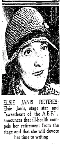 During World War I, Ms. Janis had regularly performed overseas for troops stationed behind the front line, thus earning the "sweetheart" nickname given here. YouTube has, among other things, a brief documentary about her, a short feature from 1926, and a comic song from 1912.