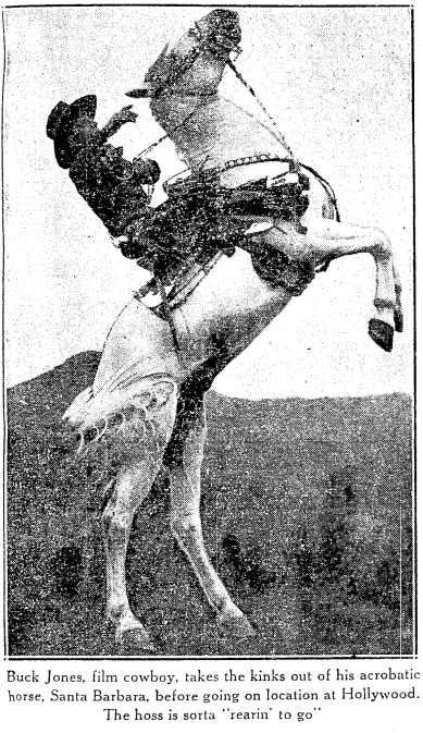 Needless to say, Buck Jones (1891-1942) had taken a stage name for the movies; he was born Charles Frederick Gebhart. After two tours of duty in the U.S. Army, ending in 1913, the future Mr. Jones became a cowboy, then a bit player and stuntman in the movies, and then a star in his own right. He was featured in westerns from 1920 right up until his death.