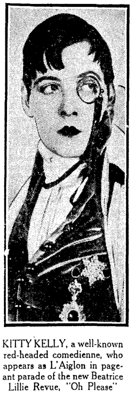 Kitty Kelly (1902-1968), born Sue O'Neil, was a regular Broadway performer until 1930, and then went into movies, appearing in approximately 39 of them between 1930 and the end of the Second World War. She performed in movies and TV series right up to her death from cancer in 1968, appearing in Get Smart, Perry Mason, Batman, and The F.B.I. in the 1960s.