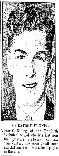 Since Victor C. Killing had a unique name, I decided to look him up in the Toronto city directories. I found him in the 1938 Toronto city directory, working as a draftsman and living at 60 Herbert Avenue. Two other family members lived there: Kathleen G. Killing worked as a stenographer for the Clerk of the Legislative Assembly, and William C. Killing, who presumably was their father, was listed as a staff inspector for the OPP. (It might have been disconcerting at times to hear that Inspector Killing was on the job.)