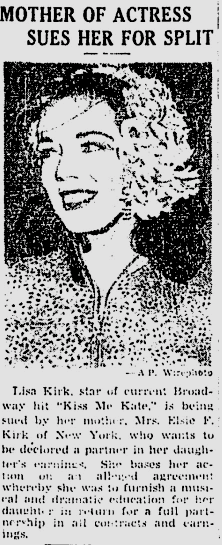 Lisa Kirk (1925-1990) went on to have a long career in theatre and television. She passed away from lung cancer despite being a non-smoker, which seems like horrible bad luck. I could find nothing on what happened to her mother's lawsuit.