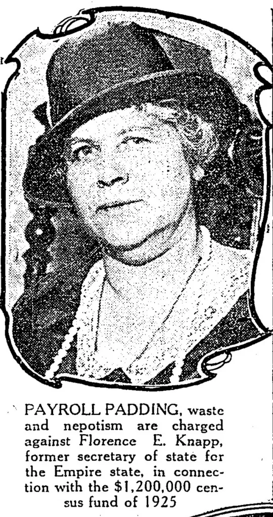 Florence E. S. Knapp (1875-1949) was elected to the post of secretary of state for New York, holding the position from 1925 to 1927. She was convicted of grand larceny in 1928: during the compiling of the 1925 census, she put her stepdaughter on the payroll, forged her signature on her paycheques, and spent the money on clothes.
