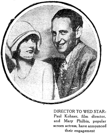 Paul Kohner (1902-1988) and Mary Philbin (1902-1993) had been a couple since 1923; they met when director Erich von Stroheim introduced them to each other. They had secretly planned to become engaged in 1926 but it was called off when Ms. Philbin's parents objected - she was Jewish and he was Catholic.