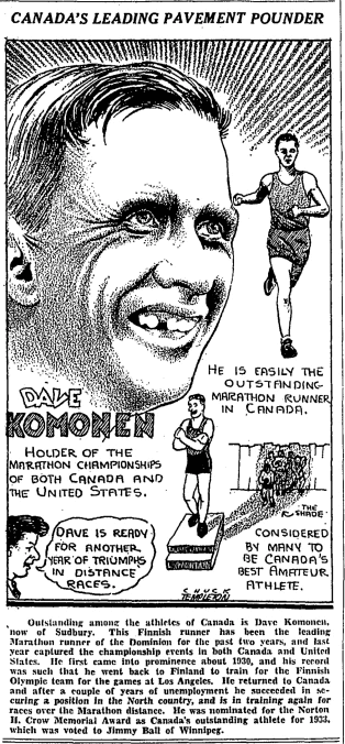 Taavi Komonen (1898-1978) emigrated to Canada from his native Finland in 1929, with his first name being anglicized to "Dave" at that time. When not struggling to find work, he was competing in marathons, winning the Canadian National Marathon championship in 1932. After finishing second in the Boston Marathon in 1933, he was forced to sell his running shoes to pay for a ticket back to Toronto.