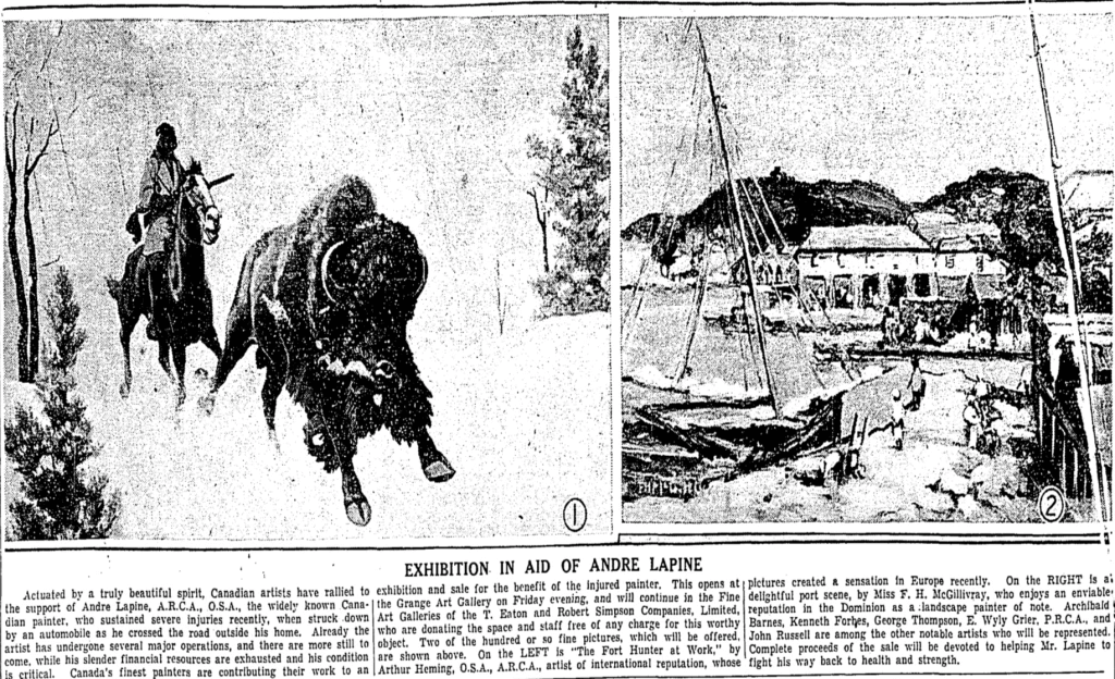 A committee was formed to pay his medical bills after he was hit by a car in Toronto in 1934. Happily, he recovered from his injuries and was able to resume painting.