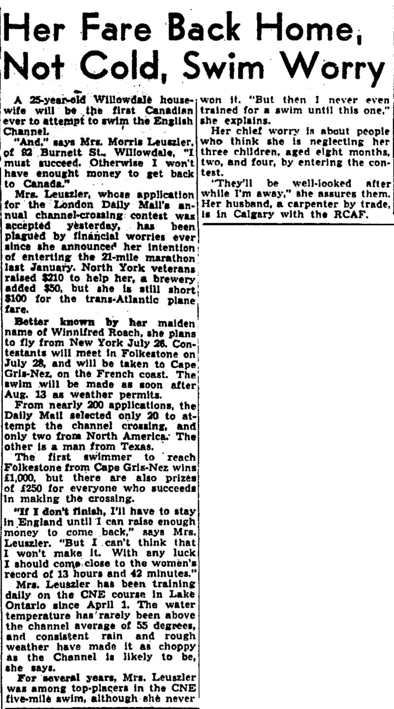 Winnie Leuszler (1926-2004) made her attempt to swim the English Channel on August 16 and was successful - she became the first Canadian to swim the channel. Her time was 13 hours, 25 minutes, which beat the women's record of 13:42. (The current record holder is Trent Grimsey of Australia, who crossed the channel in 6 hours and 55 minutes. The current female record holder is Yvetta Hlaváčová, who made it across in 7:25.)